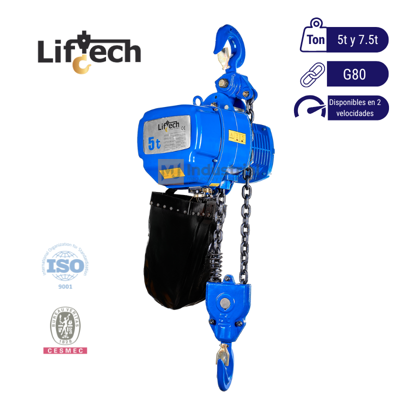 Tecle eléctrico con gancho superior marca LIFTECH, modelo ECH, Capacidad de carga 5.000Kg y 7.500Kg con versiones disponibles en 1 y 2 velocidad. Producto con 3 metros de altura de elevación de serie. Largo de cadena puede variar según requerimiento hasta 30 metros. Equipo de 1 velocidad, con limitador opcional.